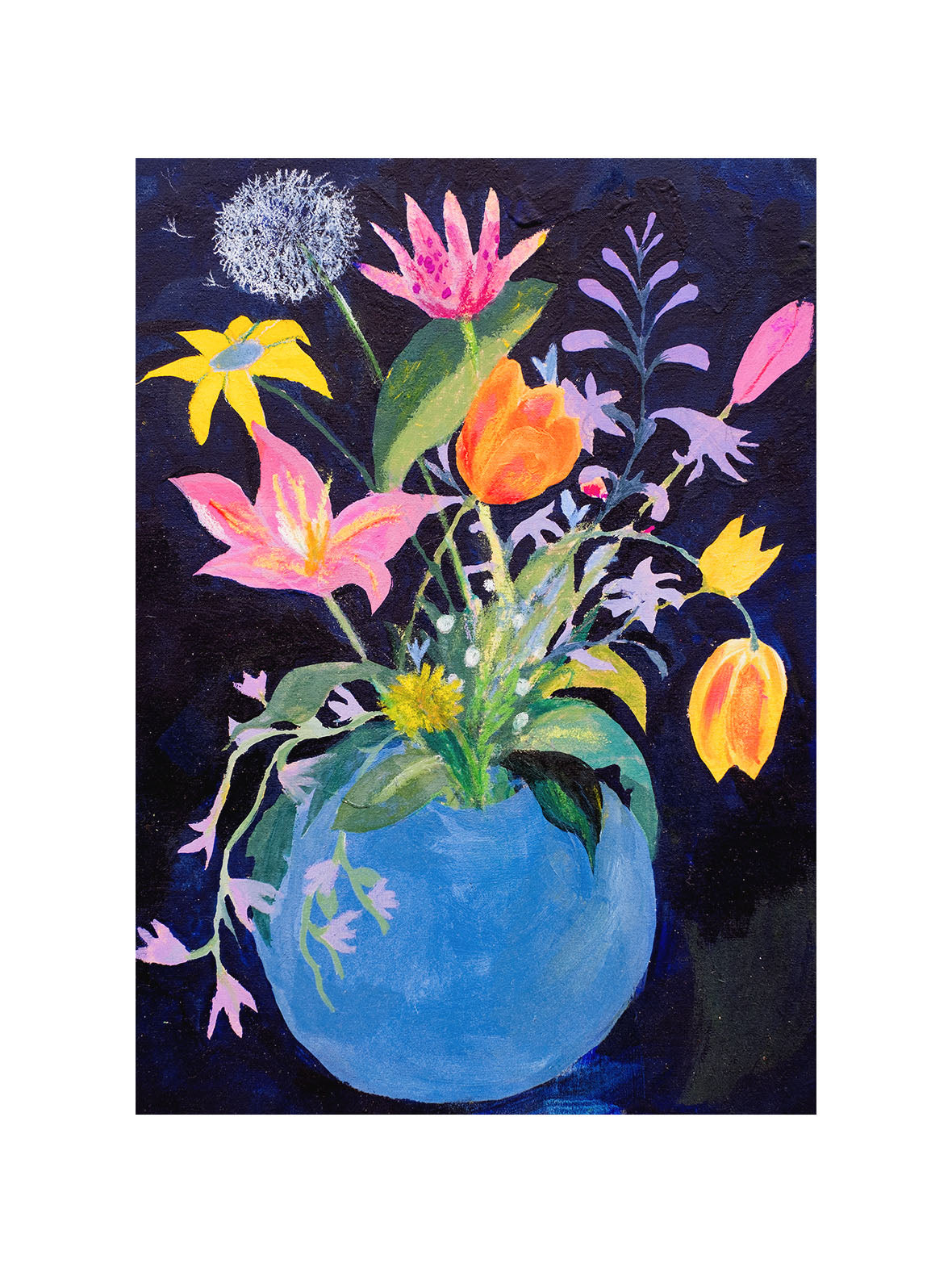 In the paintings, the artist tries to stretch out precious moments. Moments that sometimes last very briefly but which you would like to experience longer; like you would want a vase of flowers to bloom forever. The paintings become an almost meditative work of standing still in the whirlwind of possibilities of life.